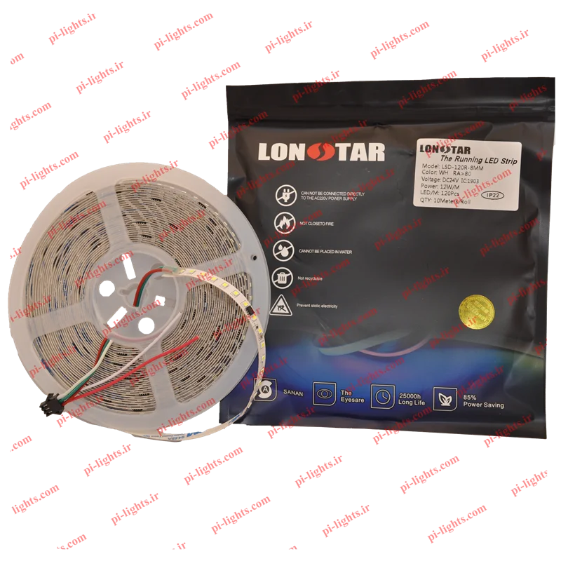 ال ای دی نواری Lonstar 24 ولت تراکم 120 رونده IC : (120 عدد LED در هر متر) یک نوار LED ولتاژ ثابت (Constant Voltage) با چیپهای SMD (معمولاً SMD 2835) است که برای نورپردازیهای حرفهای، دکوراسیون داخلی و خارجی، و کاربردهای صنعتی طراحی شده است. این نوار با عرض 8 یا 10 میلیمتر، در رنگهای سفید مهتابی (6000-6500 کلوین)، آفتابی (3000-3200 کلوین)، نچرال (4000-4500 کلوین)، و گاهی RGB عرضه میشود. تراکم 120 LED در متر نوری یکنواخت با شدت مناسب ارائه میدهد و به دلیل ولتاژ 24 ولت، افت ولتاژ کمتری نسبت به نوارهای 12 ولت در متراژهای طولانی دارد. این نوار نیازی به درایور جریان ثابت ندارد و با منبع تغذیه 24 ولت DC کار میکند، که نصب را ساده و کارآمد میکند. این نوار به صورت رونده می باشد و به کمک کنترولرهای مخصوص این عمل انجام می شود.
